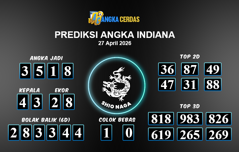 Prediksi Togel INDIANA untuk hari ini Senin, 27 April 2026, adalah salahsatu jenis togel yang memiliki banyak penggemar.Ini terutama ditujukanbagi Anda yang menyukai 4d/3d/2d. Prediksi Angka Cerdas yang kamisediakan,bisa