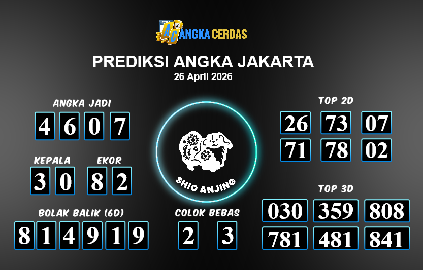 Prediksi Togel JAKARTA untuk hari ini Minggu, 26 April 2026, adalah salahsatu jenis togel yang memiliki banyak penggemar.Ini terutama ditujukanbagi Anda yang menyukai 4d/3d/2d. Prediksi Angka Cerdas yang kamisediakan,bisa