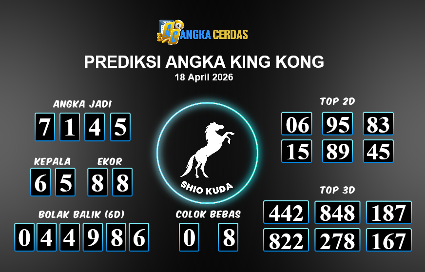 Prediksi Togel KING KONG untuk hari ini Sabtu, 18 April 2026, adalah salahsatu jenis togel yang memiliki banyak penggemar.Ini terutama ditujukanbagi Anda yang menyukai 4d/3d/2d. Prediksi Angka Cerdas yang kamisediakan,bisa