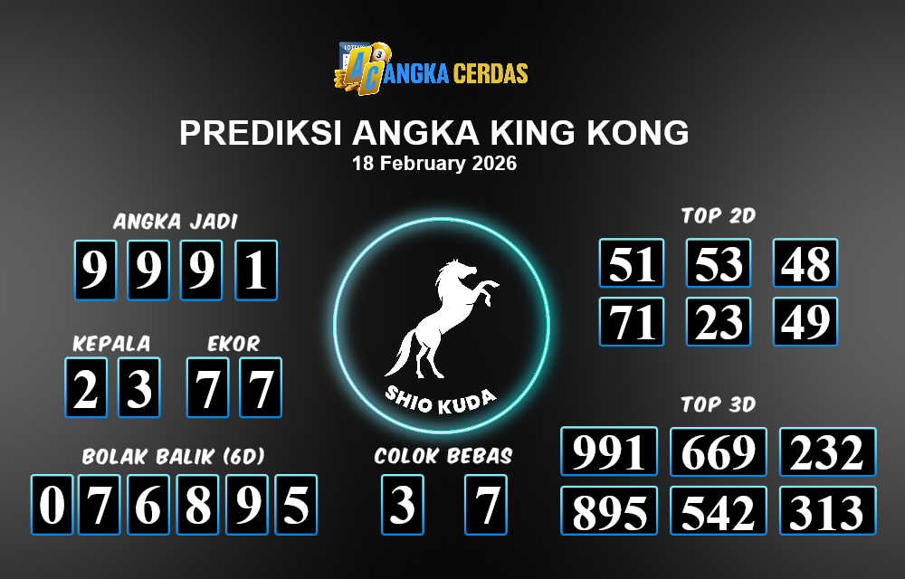 Prediksi Togel KING KONG untuk hari ini Rabu, 18 Februari 2026, adalah salah