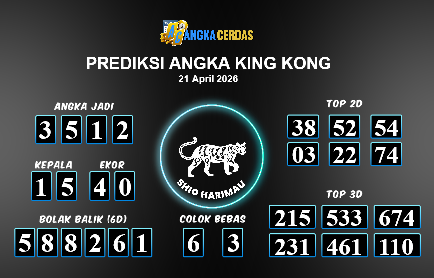 Prediksi Togel KING KONG untuk hari ini Selasa, 21 April 2026, adalah salahsatu jenis togel yang memiliki banyak penggemar.Ini terutama ditujukanbagi Anda yang menyukai 4d/3d/2d. Prediksi Angka Cerdas yang kamisediakan,bisa