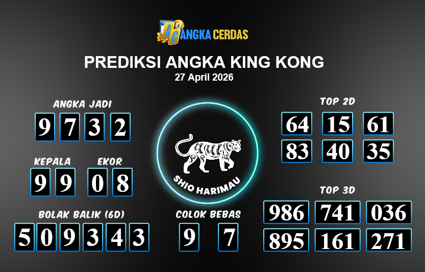 Prediksi Togel KING KONG untuk hari ini Senin, 27 April 2026, adalah salahsatu jenis togel yang memiliki banyak penggemar.Ini terutama ditujukanbagi Anda yang menyukai 4d/3d/2d. Prediksi Angka Cerdas yang kamisediakan,bisa