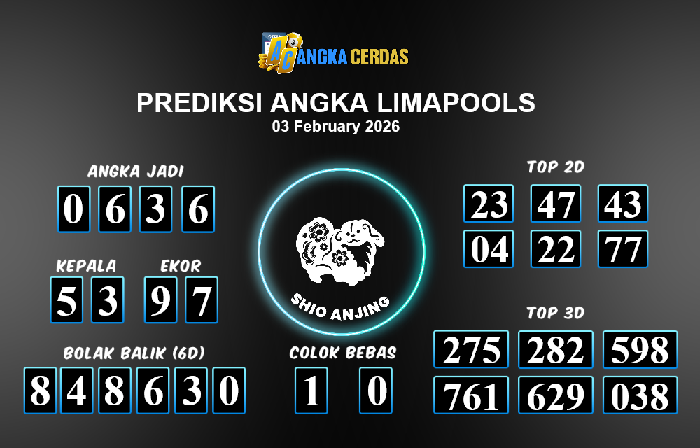 Prediksi Togel LIMAPOOLS untuk hari ini Selasa 03 Februari 2026, adalah salah