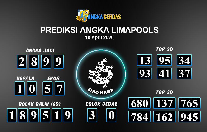 Prediksi Togel LIMAPOOLS untuk hari ini Sabtu, 18 April 2026, adalah salahsatu jenis togel yang memiliki banyak penggemar.Ini terutama ditujukanbagi Anda yang menyukai 4d/3d/2d. Prediksi Angka Cerdas yang kamisediakan,bisa