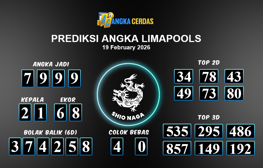 Prediksi Togel LIMAPOOLS untuk hari ini Kamis, 19 Februari 2026, adalah salah
