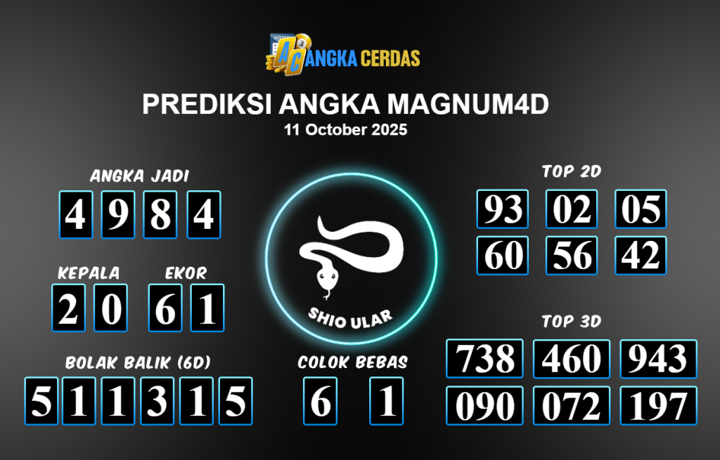 Prediksi Togel MAGNUM4D untuk hari ini Sabtu 11 Oktober 2025, adalah salah