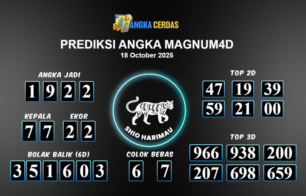Prediksi Togel MAGNUM4D untuk hari ini Sabtu 18 Oktober 2025, adalah salah
