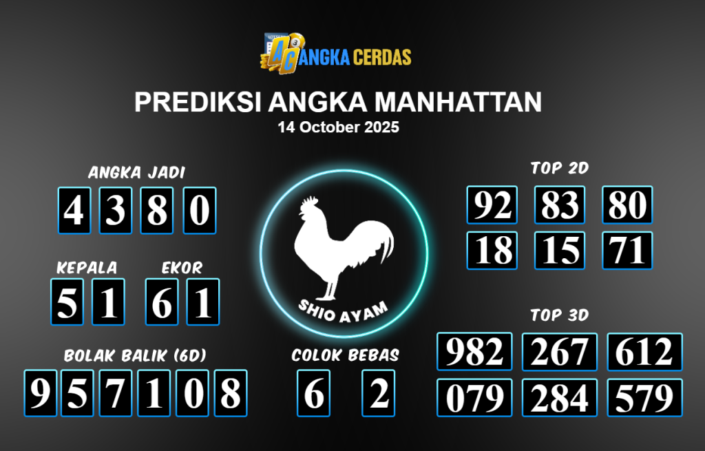 Prediksi Togel MANHATTAN untuk hari ini Selasa 14 Oktober 2025, adalah salah