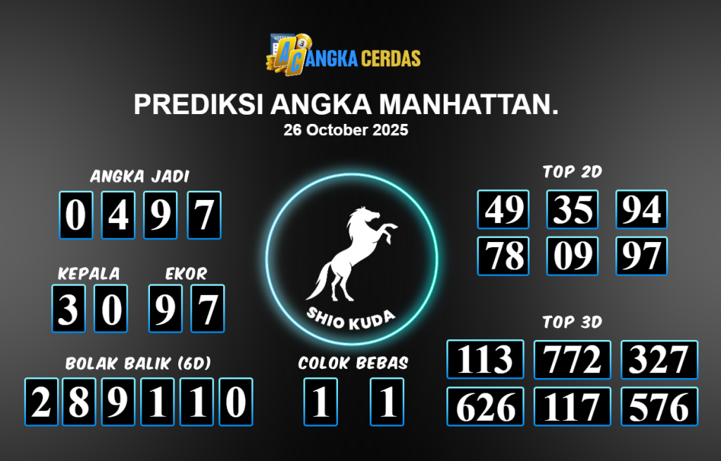 Prediksi Togel MANHATTAN untuk hari ini Minggu 26 Oktober 2025, adalah salah