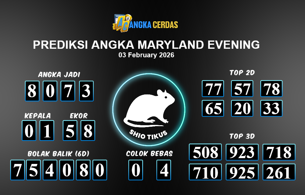 Angka Cerdas : Bocoran Prediksi Togel MARYLAND EVENING Tanggal 03 FEBRUARI 2026