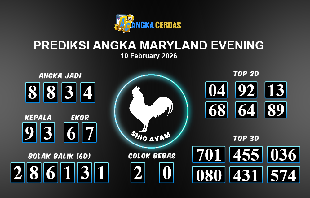 Prediksi Togel MARYLAND EVENING untuk hari ini Selasa, 10 Februari 2026, adalah salah
