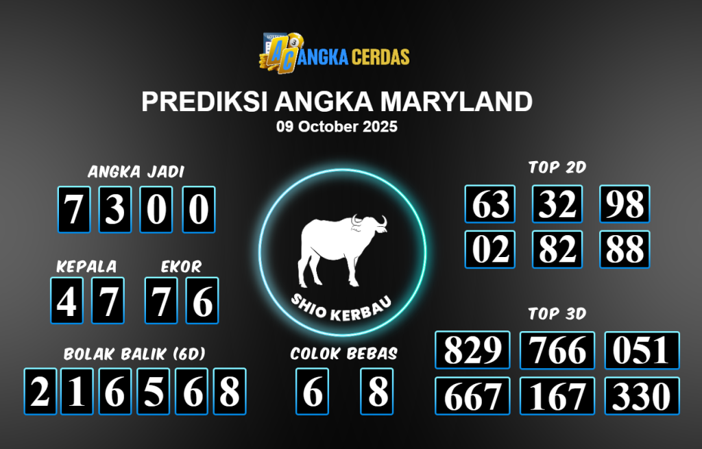 Prediksi Togel MARYLAND untuk hari ini Kamis 09 Oktober 2025, adalah salah