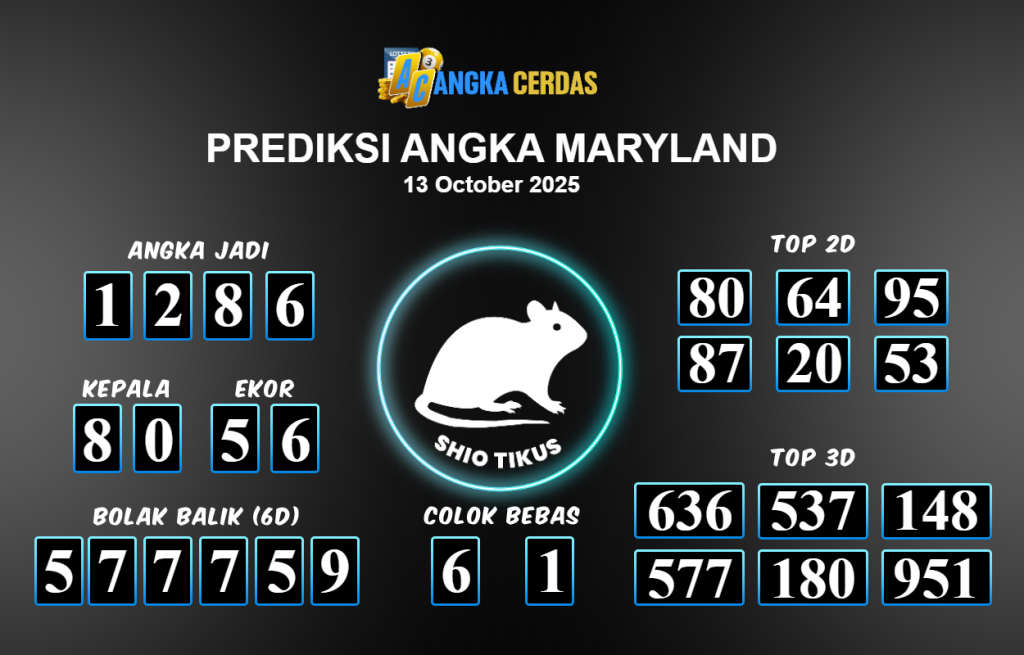 Prediksi Togel MARYLAND untuk hari ini Senin 13 Oktober 2025, adalah salah