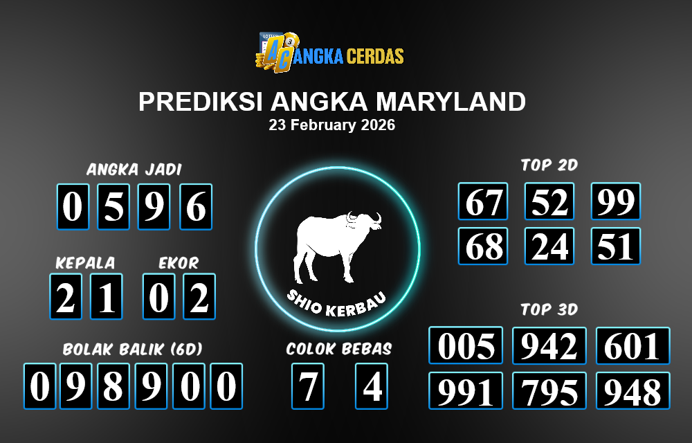 Prediksi Togel MARYLAND untuk hari ini Senin, 23 Februari 2026, adalah salah