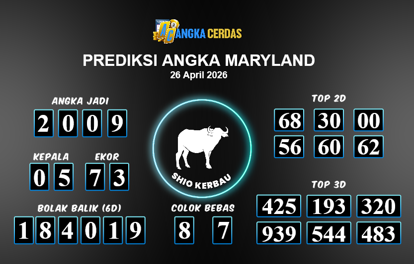 Prediksi Togel MARYLAND untuk hari ini Minggu, 26 April 2026, adalah salahsatu jenis togel yang memiliki banyak penggemar.Ini terutama ditujukanbagi Anda yang menyukai 4d/3d/2d. Prediksi Angka Cerdas yang kamisediakan,bisa