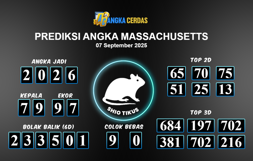 Prediksi Togel MASSACHUSETTS untuk hari ini Minggu 07 September 2025, adalah salah