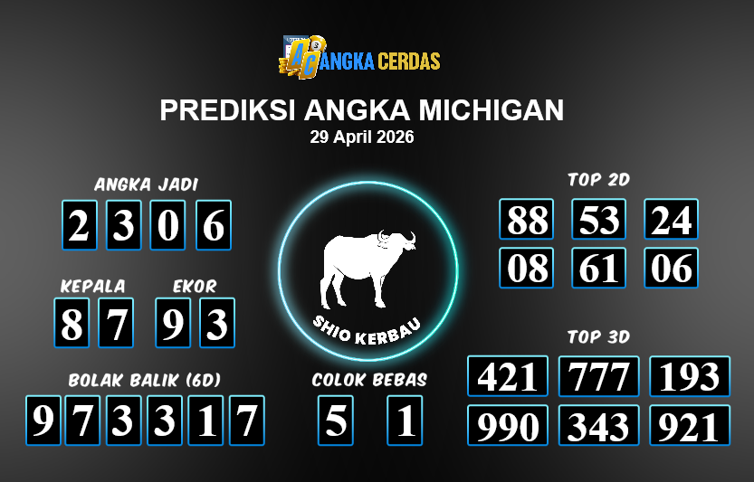 Prediksi Togel MICHIGAN untuk hari ini Rabu, 29 April 2026, adalah salahsatu jenis togel yang memiliki banyak penggemar.Ini terutama ditujukanbagi Anda yang menyukai 4d/3d/2d. Prediksi Angka Cerdas yang kamisediakan,bisa