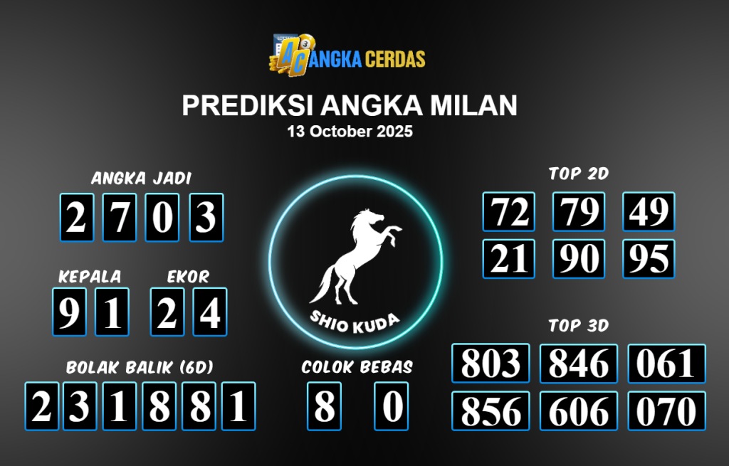 Prediksi Togel MILAN untuk hari ini Senin 13 Oktober 2025, adalah salah