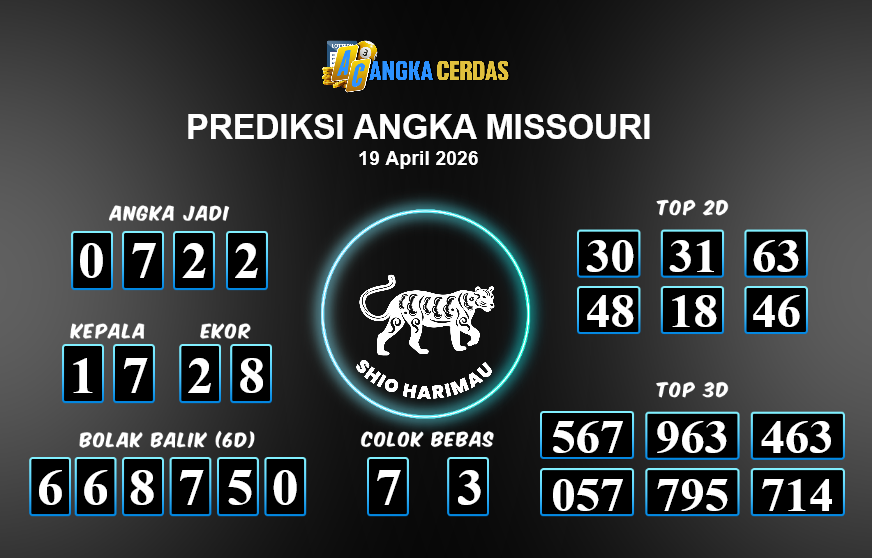 Prediksi Togel MISSOURI untuk hari ini Minggu, 19 April 2026, adalah salahsatu jenis togel yang memiliki banyak penggemar.Ini terutama ditujukanbagi Anda yang menyukai 4d/3d/2d. Prediksi Angka Cerdas yang kamisediakan,bisa