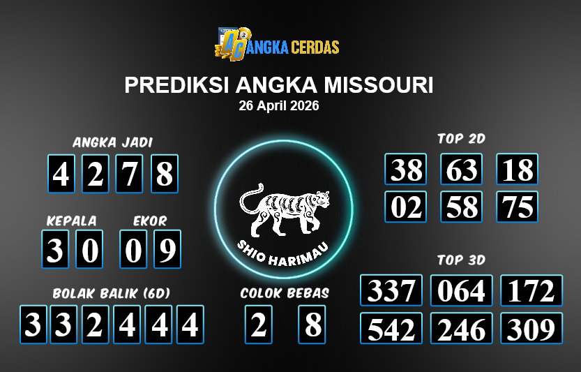 Prediksi Togel MISSOURI untuk hari ini Minggu, 26 April 2026, adalah salahsatu jenis togel yang memiliki banyak penggemar.Ini terutama ditujukanbagi Anda yang menyukai 4d/3d/2d. Prediksi Angka Cerdas yang kamisediakan,bisa
