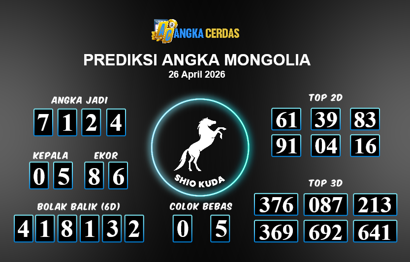 Prediksi Togel MONGOLIA untuk hari ini Minggu, 26 April 2026, adalah salahsatu jenis togel yang memiliki banyak penggemar.Ini terutama ditujukanbagi Anda yang menyukai 4d/3d/2d. Prediksi Angka Cerdas yang kamisediakan,bisa