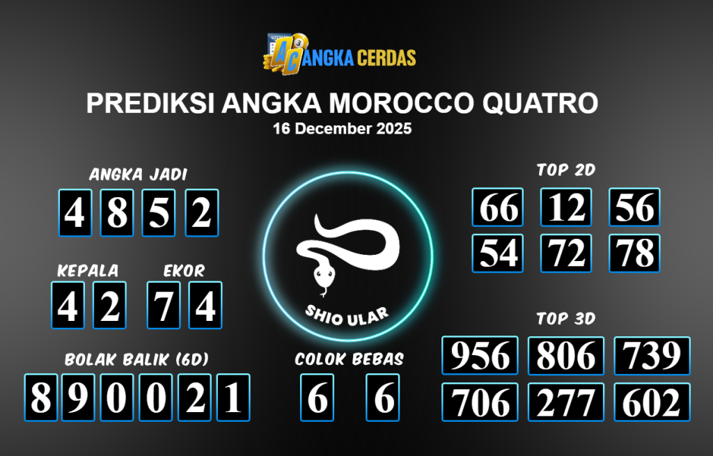 Prediksi Togel MOROCCO QUATRO untuk hari ini Selasa 16 Desember November 2025, adalah salah