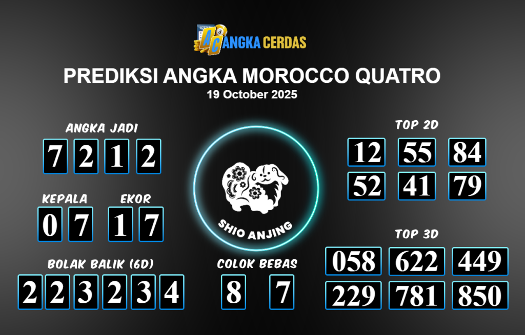 Prediksi Togel MOROCCO QUATRO untuk hari ini Minggu 19 Oktober 2025, adalah salah