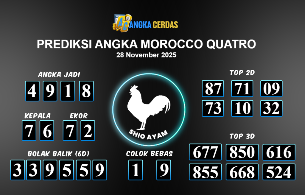 Prediksi Togel MOROCCO QUATRO untuk hari ini Jumat 28 November 2025, adalah salah