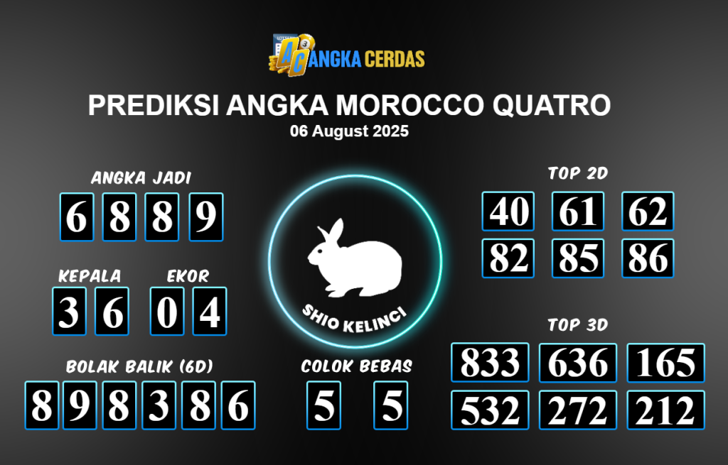 Prediksi Togel MOROCCO QUATROuntuk hari ini Rabu, 6 Agustus 2025, adalah salah