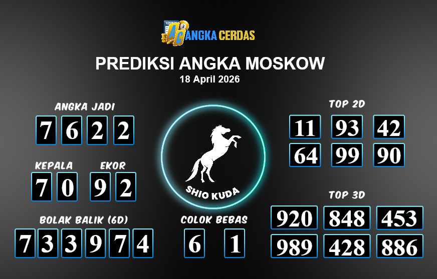 Prediksi Togel MOSKOW untuk hari ini Sabtu, 18 April 2026, adalah salahsatu jenis togel yang memiliki banyak penggemar.Ini terutama ditujukanbagi Anda yang menyukai 4d/3d/2d. Prediksi Angka Cerdas yang kamisediakan,bisa