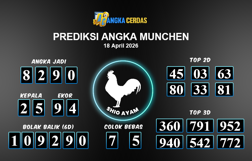 Prediksi Togel MUNCHEN untuk hari ini Sabtu, 18 April 2026, adalah salahsatu jenis togel yang memiliki banyak penggemar.Ini terutama ditujukanbagi Anda yang menyukai 4d/3d/2d. Prediksi Angka Cerdas yang kamisediakan,bisa