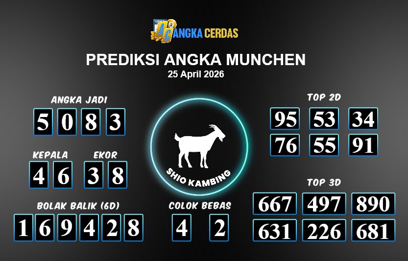 Prediksi Togel MUNCHEN untuk hari ini Sabtu, 25 April 2026, adalah salahsatu jenis togel yang memiliki banyak penggemar.Ini terutama ditujukanbagi Anda yang menyukai 4d/3d/2d. Prediksi Angka Cerdas yang kamisediakan,bisa