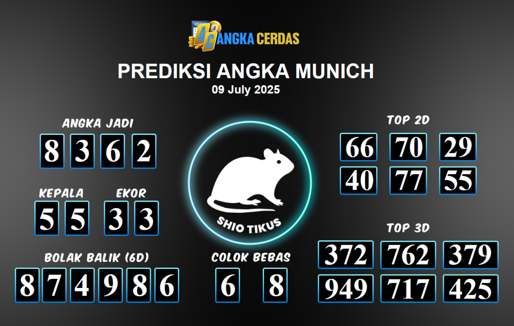 Prediksi Togel MUNICH untuk hari ini Rabu, 09 Juli 2025, adalah salah
