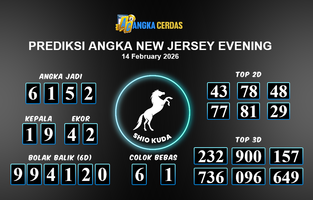 Prediksi Togel NEW JERSEY EVENING untuk hari ini Sabtu, 14 Februari 2026, adalah salah