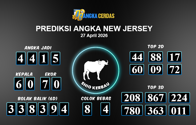 Prediksi Togel NEW JERSEY untuk hari ini Senin, 27 April 2026, adalah salahsatu jenis togel yang memiliki banyak penggemar.Ini terutama ditujukanbagi Anda yang menyukai 4d/3d/2d. Prediksi Angka Cerdas yang kamisediakan,bisa