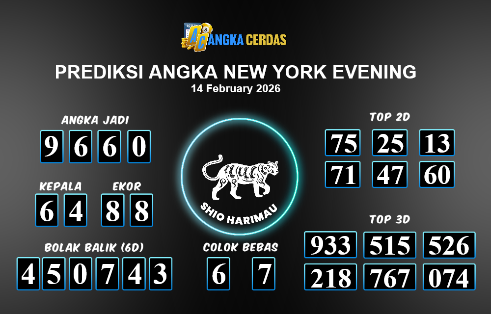 Prediksi Togel NEW YORK EVENING untuk hari ini Sabtu, 14 Februari 2026, adalah salah