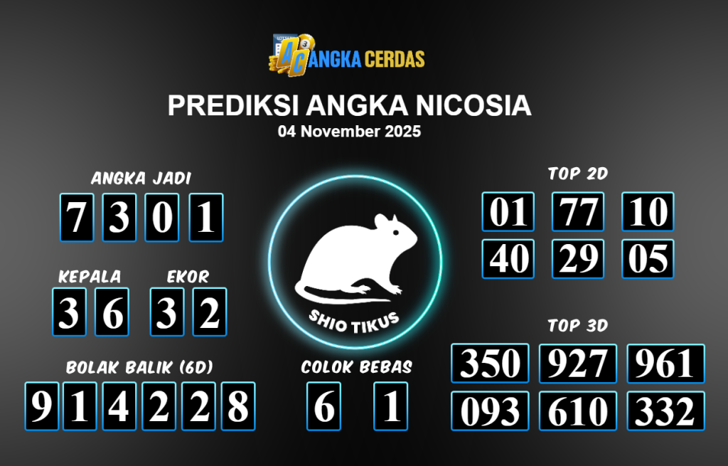 Prediksi Togel NICOSIA untuk hari ini Selasa 04 November 2025, adalah salah
