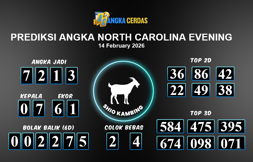 Prediksi Togel NORTH CAROLINA EVENING untuk hari ini Sabtu, 14 Februari 2026, adalah salah
