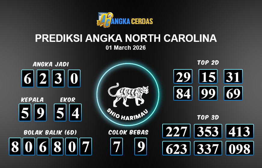 Prediksi Togel NORTH CAROLINA untuk hari ini Minggu, 01 Maret 2026, adalah salah