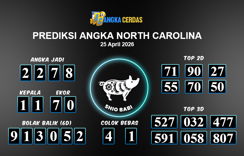 Prediksi Togel NORTH CAROLINA untuk hari ini Sabtu, 25 April 2026, adalah salahsatu jenis togel yang memiliki banyak penggemar.Ini terutama ditujukanbagi Anda yang menyukai 4d/3d/2d. Prediksi Angka Cerdas yang kamisediakan,bisa
