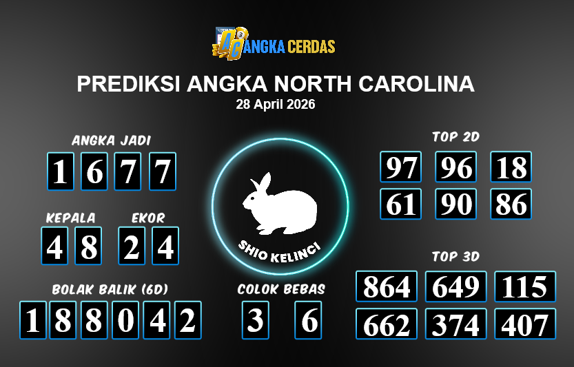 Prediksi Togel NORTH CAROLINA untuk hari ini Selasa, 28 April 2026, adalah salahsatu jenis togel yang memiliki banyak penggemar.Ini terutama ditujukanbagi Anda yang menyukai 4d/3d/2d. Prediksi Angka Cerdas yang kamisediakan,bisa