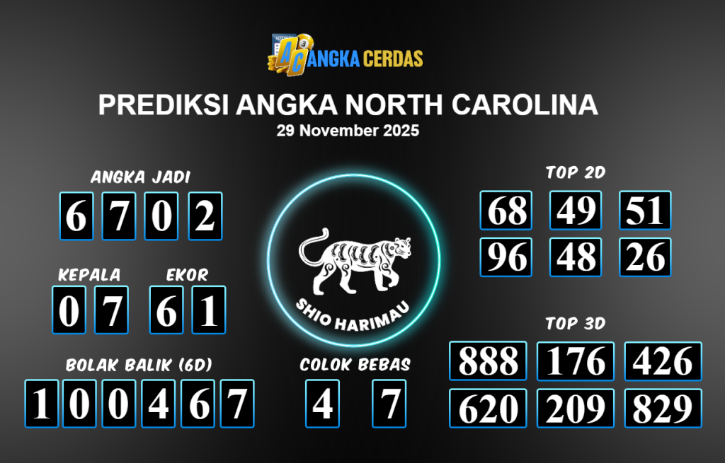 Prediksi Togel NORTH CAROLINA untuk hari ini Sabtu 29 November 2025, adalah salah