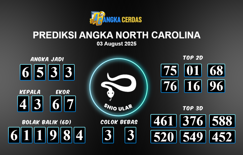 Prediksi Togel NORTH CAROLINA untuk hari ini Minggu, 3 Agustus 2025, adalah salah