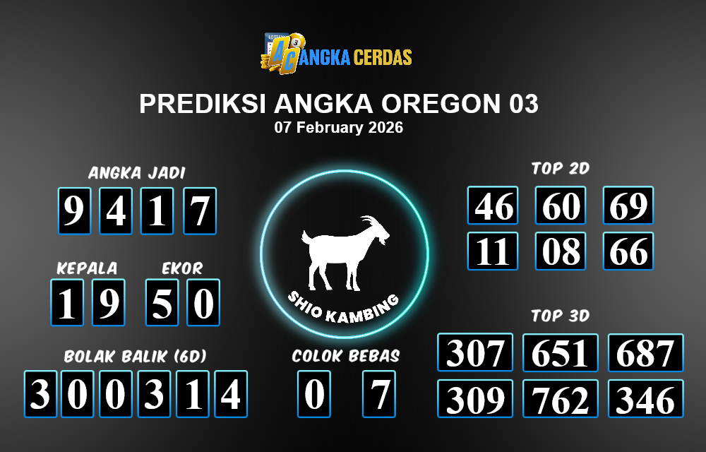 Prediksi Togel OREGON 03 untuk hari ini Sabtu, 07 Februari 2026, adalah salah