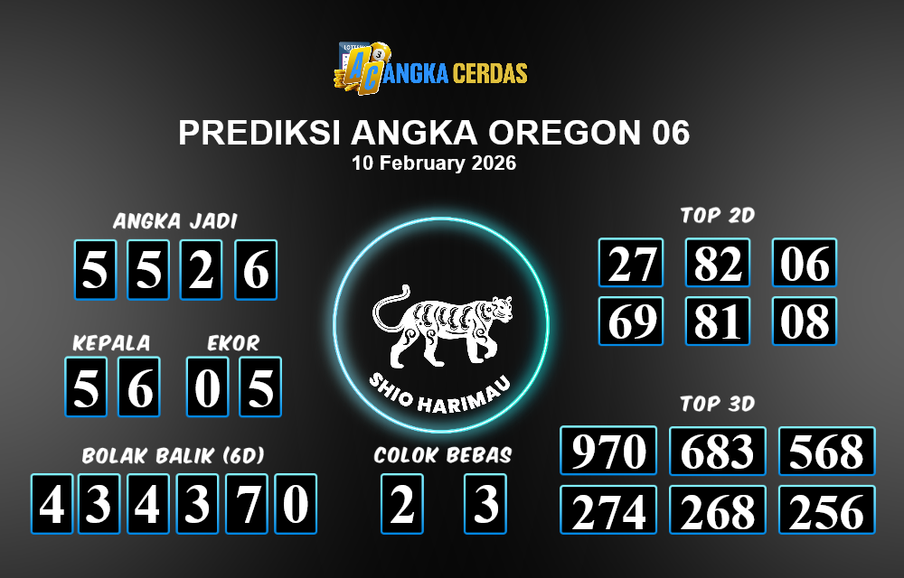 Prediksi Togel OREGON 06 untuk hari ini Selasa, 10 Februari 2026, adalah salah