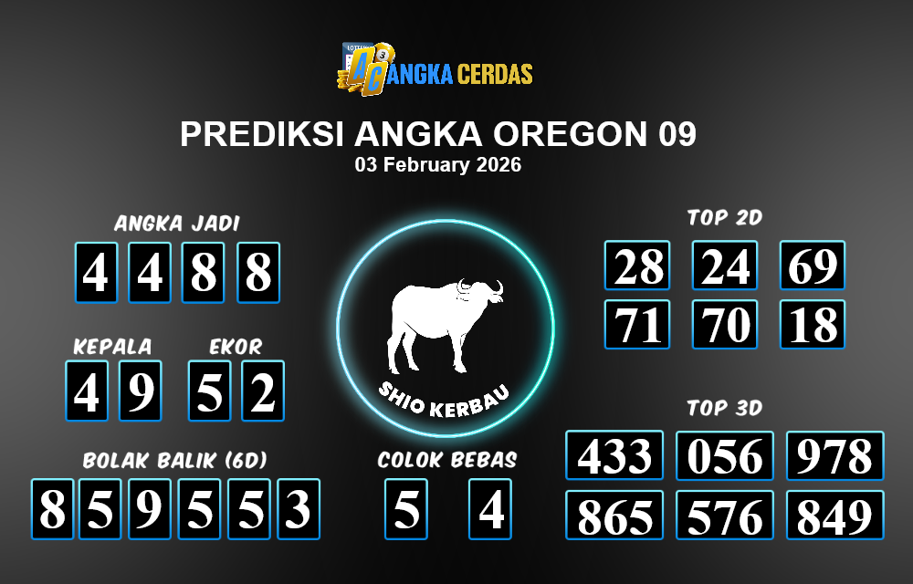 Prediksi Togel OREGON 09 untuk hari ini Selasa 03 Februari 2026, adalah salah