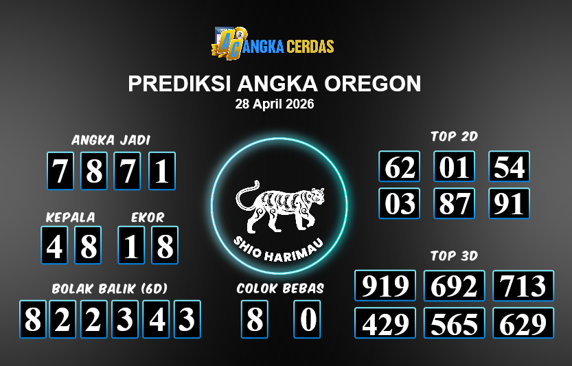 Prediksi Togel OREGON untuk hari ini Selasa, 28 April 2026, adalah salahsatu jenis togel yang memiliki banyak penggemar.Ini terutama ditujukanbagi Anda yang menyukai 4d/3d/2d. Prediksi Angka Cerdas yang kamisediakan,bisa