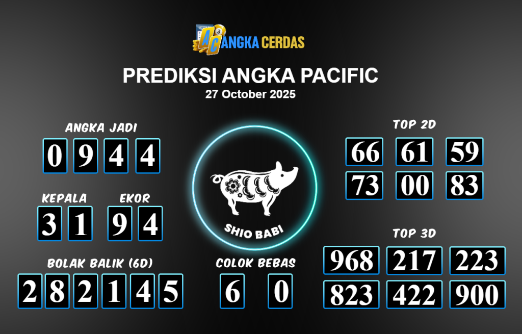Prediksi Togel PACIFIC untuk hari ini Senin 27 Oktober 2025, adalah salah