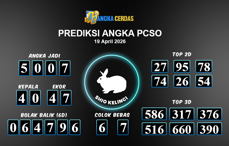 Prediksi Togel PCSO untuk hari ini Minggu, 19 April 2026, adalah salahsatu jenis togel yang memiliki banyak penggemar.Ini terutama ditujukanbagi Anda yang menyukai 4d/3d/2d. Prediksi Angka Cerdas yang kamisediakan,bisa
