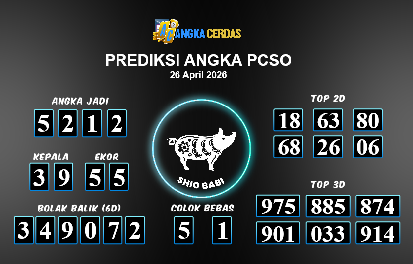 Prediksi Togel PCSO untuk hari ini Minggu, 26 April 2026, adalah salahsatu jenis togel yang memiliki banyak penggemar.Ini terutama ditujukanbagi Anda yang menyukai 4d/3d/2d. Prediksi Angka Cerdas yang kamisediakan,bisa